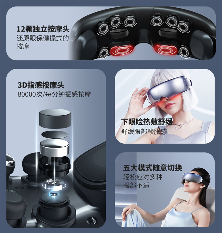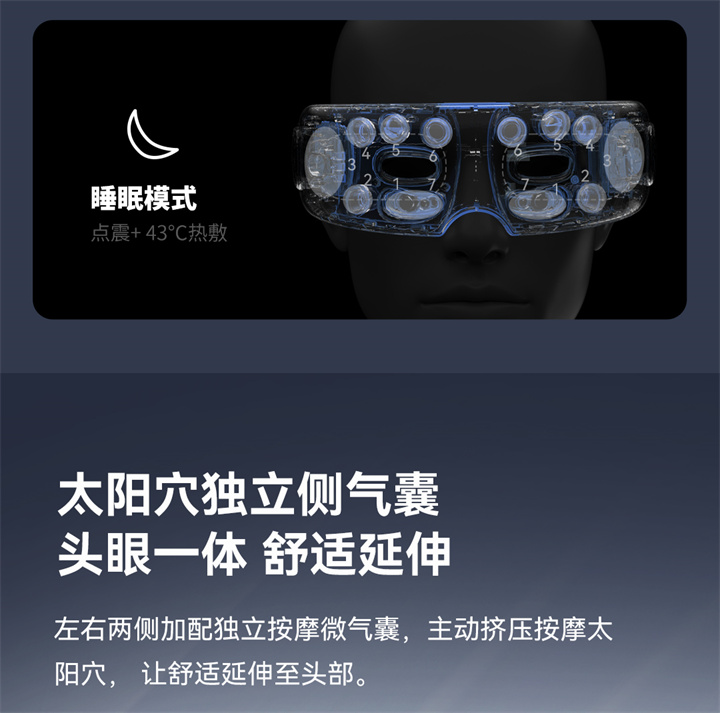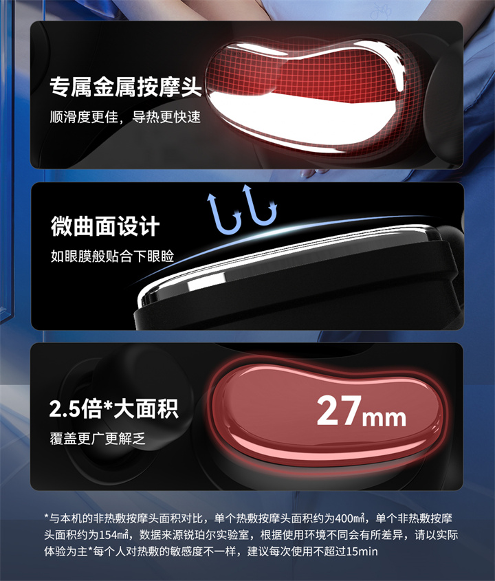 銳珀?duì)?/a>眼部按摩器RP-I50,根據(jù)國(guó)人眼型設(shè)計(jì),機(jī)身弧度更貼合眼眶,貼心預(yù)留立體凹槽,保護(hù)眼球,按摩后視力不模糊,自帶應(yīng)急可視窗,可舒緩全黑密閉焦慮感;內(nèi)置大自然的場(chǎng)景音效,讓眼睛和心靈雙重放松,還有藍(lán)牙連接,可以隨心聽歌、聽書等,更多神奇功能,等待您親自試戴發(fā)現(xiàn)……