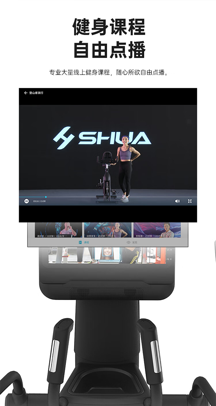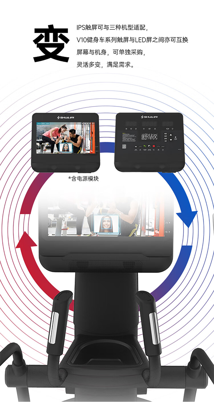 舒華立式商用健身車(chē)SH-B9100U(V10)觸屏版擁有超大顯示和操作屏幕, 可以任意設(shè)置阻力、時(shí)間和距離等參數(shù),還可以即時(shí)顯示心跳和轉(zhuǎn)速等數(shù)據(jù),同時(shí),SH-B9100U提供多項(xiàng)科學(xué)運(yùn)動(dòng)處方,更輕松掌握運(yùn)動(dòng)節(jié)奏。