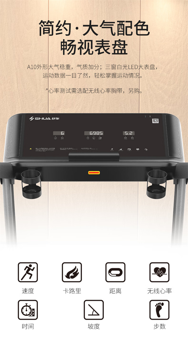 舒華家用跑步機(jī)SH-T5100持續(xù)馬力達(dá)1.25HP,具有500×1350mm的跑臺(tái),運(yùn)用無(wú)線(xiàn)心率接收模塊監(jiān)測(cè)心率,運(yùn)用6位硅膠減震設(shè)計(jì),最大承重是126kg,可以滿(mǎn)足大多數(shù)家庭的使用。