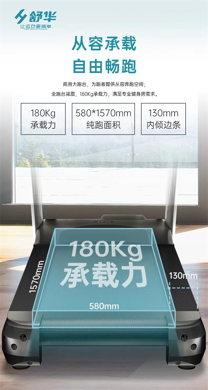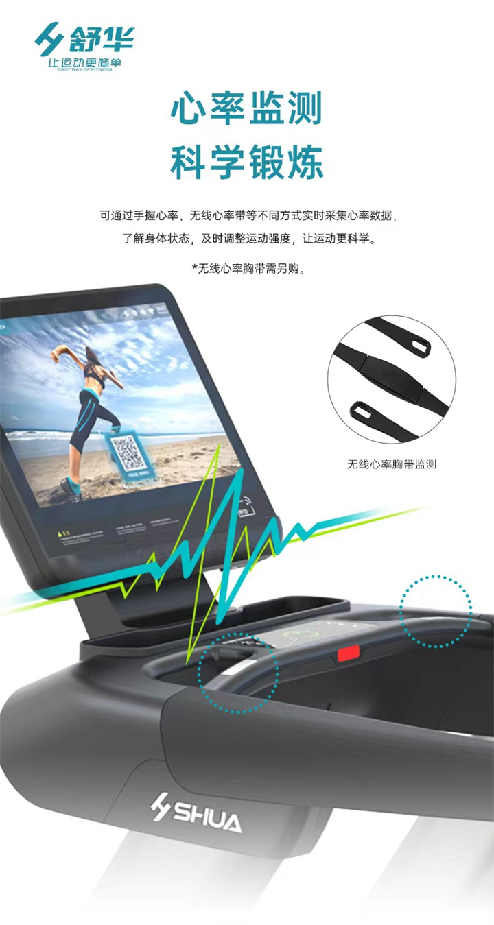 舒華商用跑步機(jī)SH-T8919采用t2.2mm黑鉆紋(可選配:t2.4免維護(hù)跑帶)的跑帶,,選用手握心率測試 自帶心率帶及增加心率控速(HRC)程序模塊、接觸式心率感應(yīng)測量心跳等數(shù)據(jù),跑步面積達(dá)580×1570mm,可承受180kg的使用者使用。